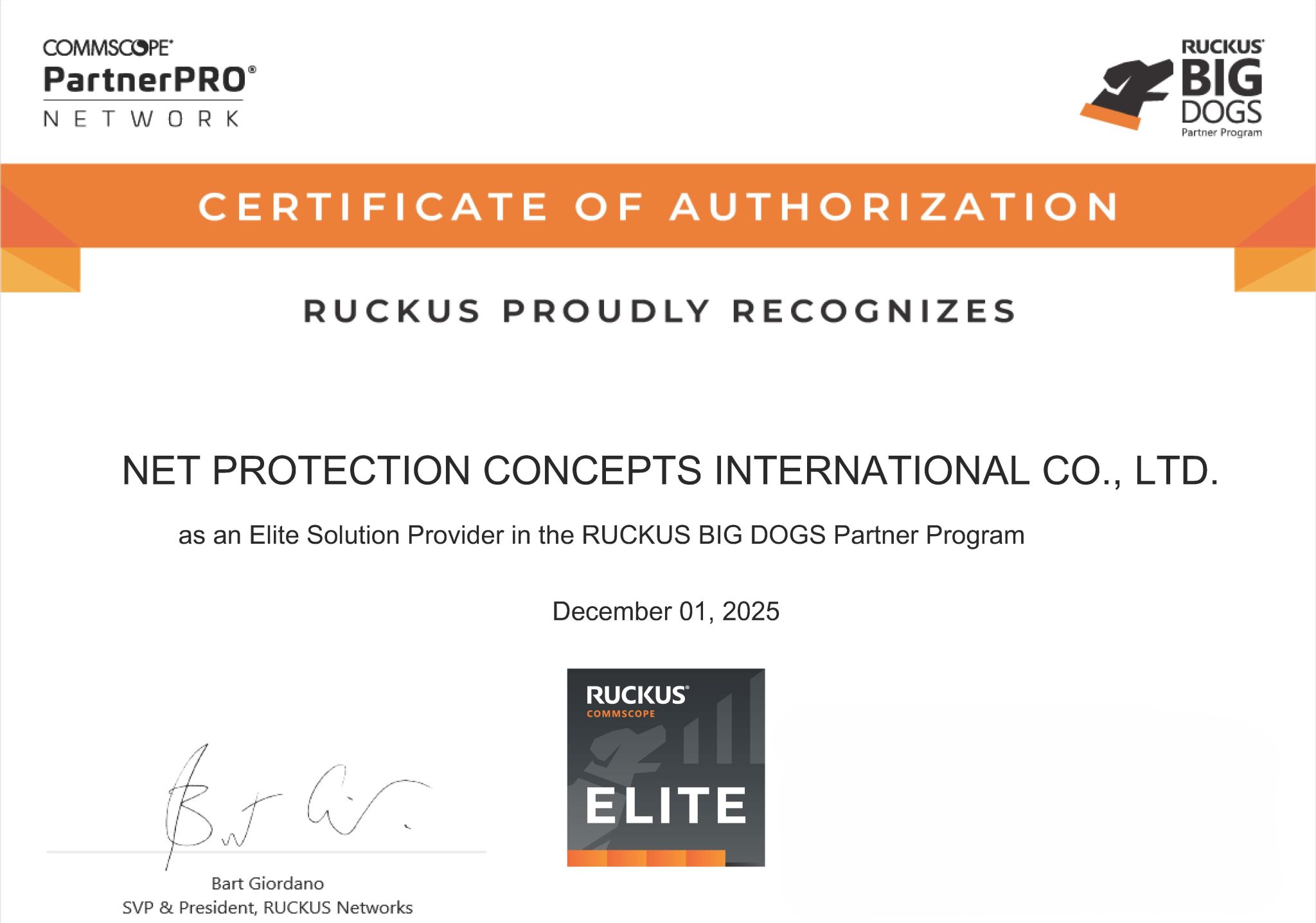 We are delighted to announce that Vistance Networks (CommScope) has officially recognized Net Protection Concepts International Co., Ltd. as a Certified Elite Solution Provider. This prestigious certification underscores our expertise and commitment to delivering world-class network solutions. We are confident it will further strengthen our network division, while providing our valued customers with even greater assurance when choosing us as their trusted partner—for upgrading legacy systems, deploying new infrastructure, or expanding existing networks. We would also like to take this opportunity to extend our heartfelt thanks for your continued support throughout 2025. |